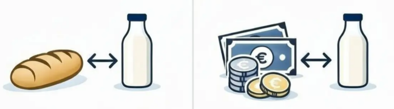 Früher haben Menschen Waren direkt getauscht – zum Beispiel Brot gegen Milch.